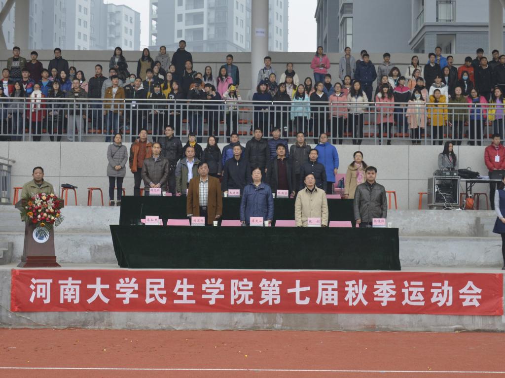 2015年11月14日上午,我院新建体育场馆正式启用。河南大学民生学院第七届秋季运动会在新体育场隆重开幕。学院院长李文山,党委书记魏剑,党委常务副书记刘道衔,常务副院长高如民,党委副书记王建国,副院长张国梁、王天仕、段廷良、王艳及相关部门负责同志出席。河南大学公共体育部副主任张俊伟、河南大学体委办公室主任赵克强应邀参加。开幕式由高如民主持。